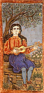 Towards the end of the inter-war period the framework defined by the new artistic pursuits, and by the concern for defining Greek identity, resulted in an interest in 'popular' or 'primitive' art, and the simple, 'popular' language. The writers of the inter-war period discovered a Greek naif of their time, the painter Theophilos. Theophilos Chatzimichail (1870-1934) was born in Mytilene. Very early on he left for Smyrna, and then moved to Volos, where he started painting in coffee shops and bakeries, finally returning to his homeland. Dressed in traditional Greek costume, he combined in his painting figures and incidents from ancient history, the struggle for independence, and everyday life. In many cases interest in the personality of Theophilos was linked to a particular predilection for the work of General Makriyannis, demonstrated by publications and repeated editions which reached a peak towards the middle of the next decade. At the same time, and in the same period, interest in the figures of Karagiozis and shadow theatre intensified, as did the taste for popular traditional architecture and popular art in general. It is significant that these examples, with the 'primitivism' of their artistic expression, should chime with the aims of the avant-garde not only in Europe but all over the world.